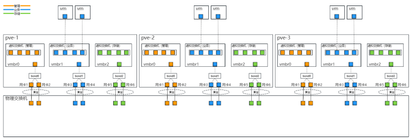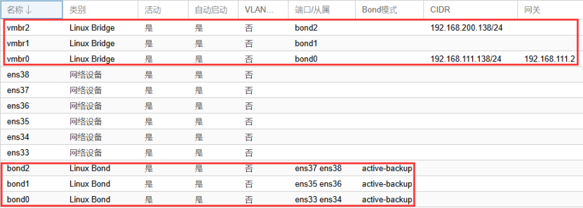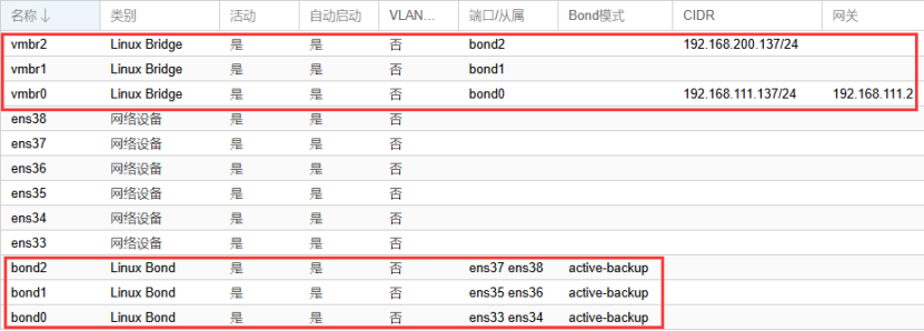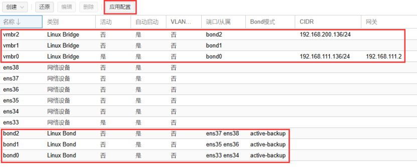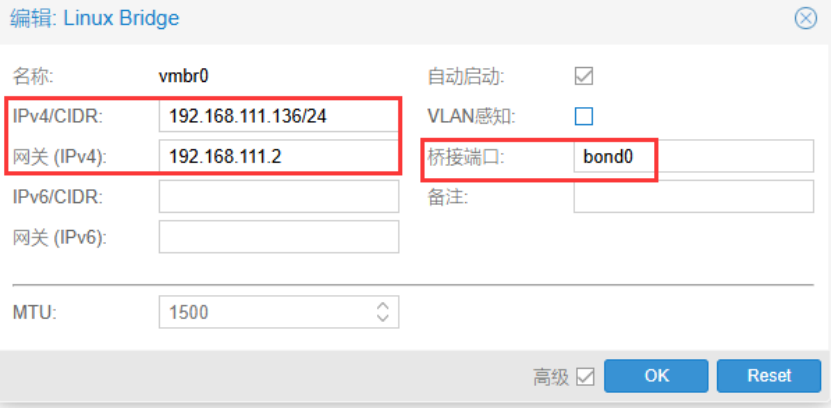 编辑虚拟交换机vmbr0,桥接bond0,用于传输PVE平台的管理流量。