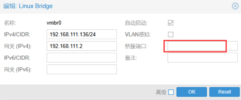 编辑虚拟交换机vmbr0,此处会修改默认的虚拟网络结构,先将默认的桥接端口ens33删除。