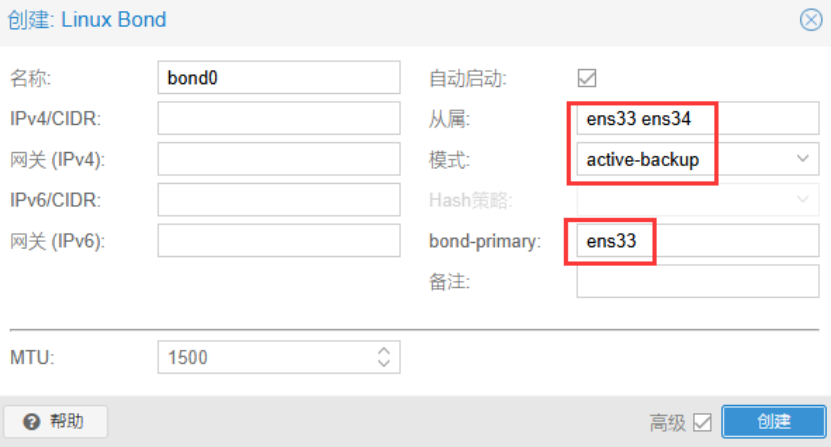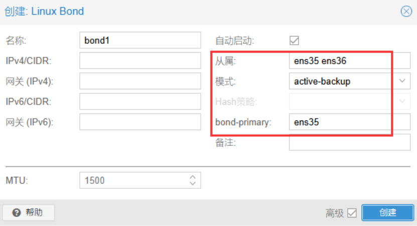 创建Linux Bond:bond0 ,将网卡1和网卡2聚合到bond0接口上。模式选择主备方式,第一块网卡为主,承担数据传输工作;只有当主网卡连接的链路发生故障时,流量才切换到备用网卡所连接的链路。模式也可配置为LACP,即基于LACP协议的链路聚合,该模式需要在物理交换机上配置后才生效。