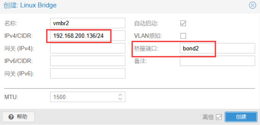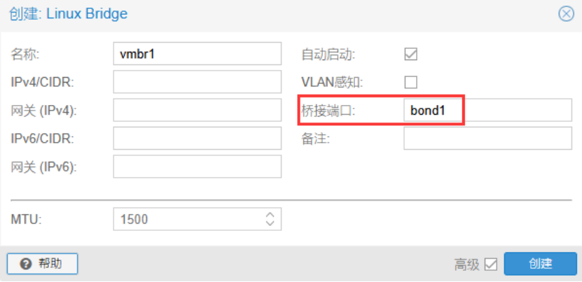 创建虚拟交换机vmbr1,桥接bond1,用于传输虚拟机的业务流量。
