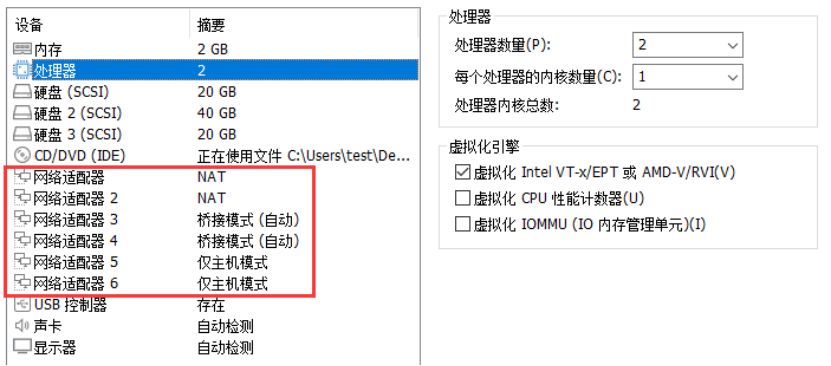 注意:CPU需要勾选虚拟化,网络适配器1和2使用默认的NAT网络,网络适配器3和4使用桥接网络,网络适配器5和6使用仅主机网络。虚拟机创建完成后,第一块20G的硬盘用于安装PVE系统,再添加一块40G的硬盘用于Ceph分布式存储,一块20G的硬盘用于Ceph缓存。