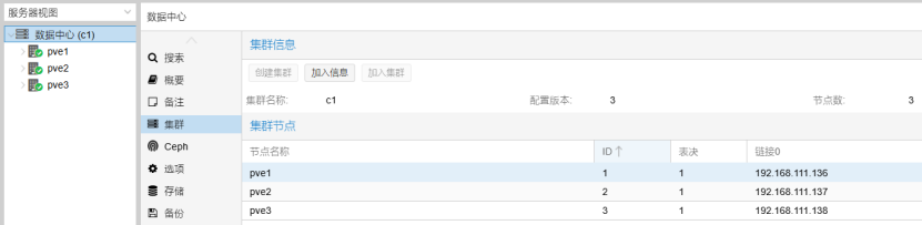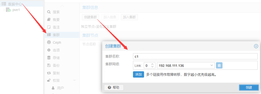 登录节点1的管理界面,创建集群,集群名自定义。当前集群只有一个节点,需要添加其它节点。