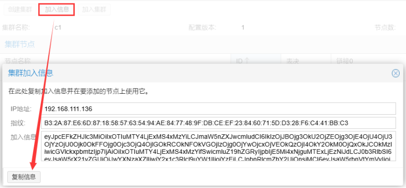 点击集群的“加入信息”并复制,该信息后续在其他节点加入集群时使用。