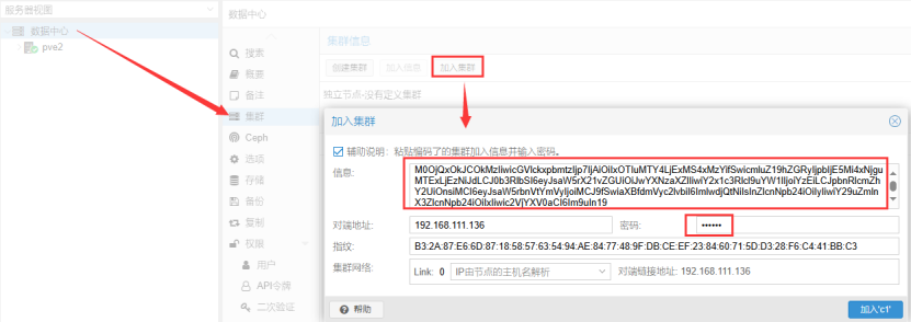 登录节点2的管理界面,加入集群,粘贴刚才复制的信息,密码为pve1的root密码。