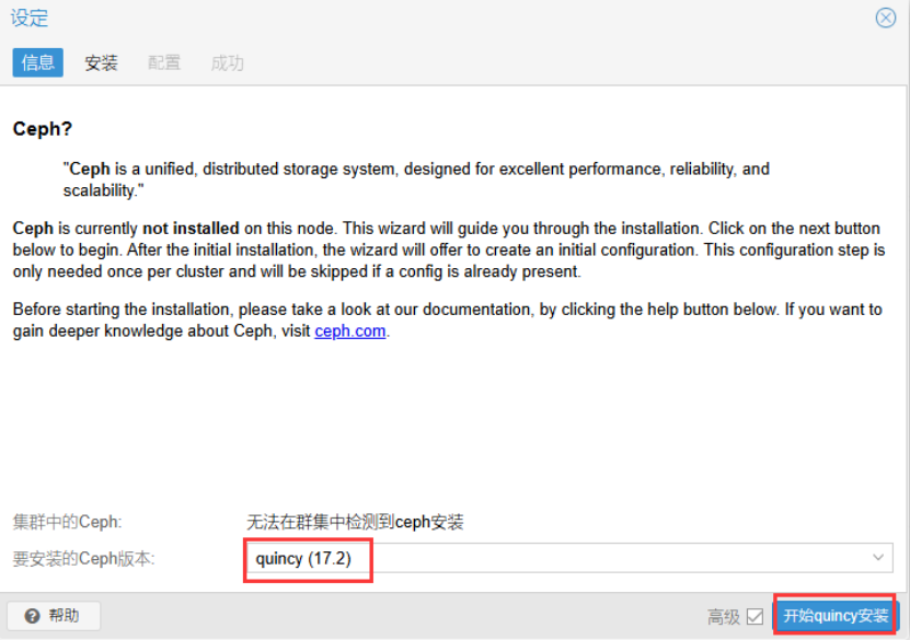 选择节点2,选择Ceph-》安装Ceph。