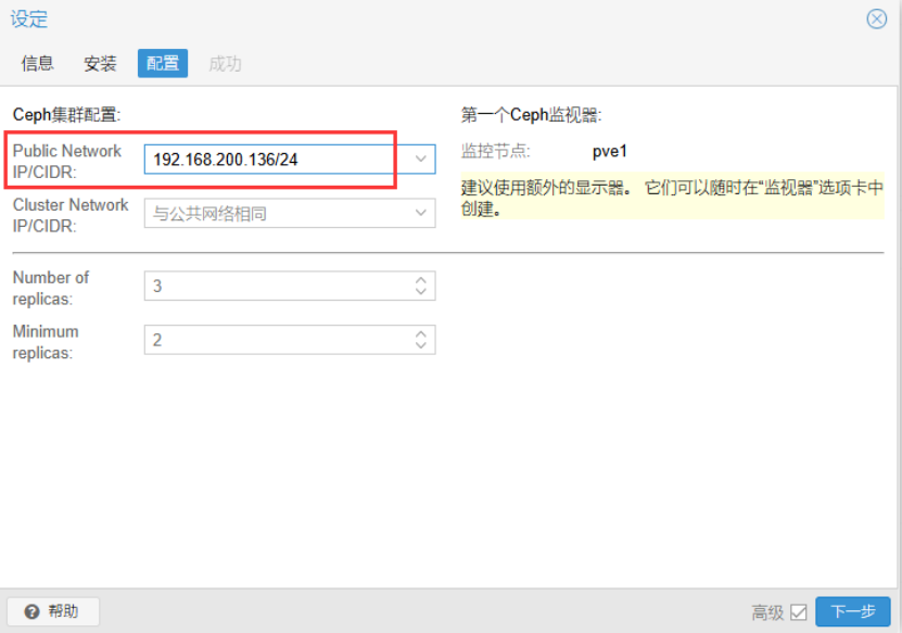 公共网络选择pve1节点的存储IP地址(不要选管理IP地址)。管理、业务、存储这3种流量要物理分流,走不同的物理网络通道。