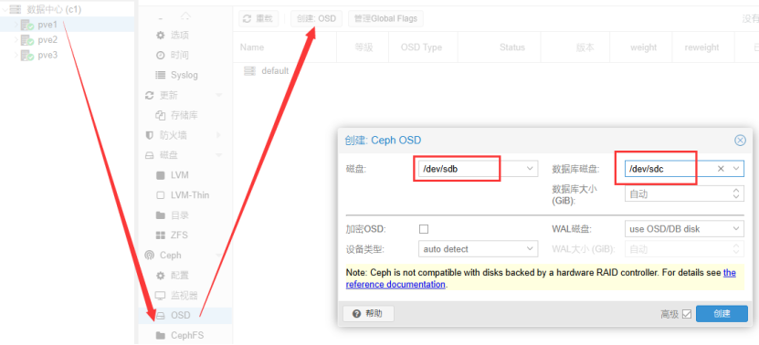 节点1,进入Ceph-》OSD,创建OSD磁盘。磁盘选择第二块硬盘sdb,第三块磁盘sdc作为数据库磁盘,主要用于缓存。