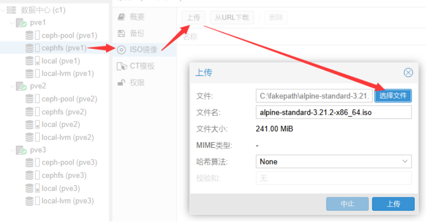 ISO存储选择cephfs文件系统,选择测试用的iso文件