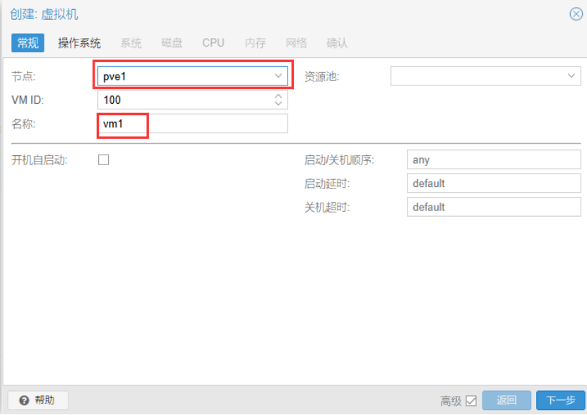 创建虚拟机,可以选择在哪个节点上运行虚拟机,虚拟机名称自定义