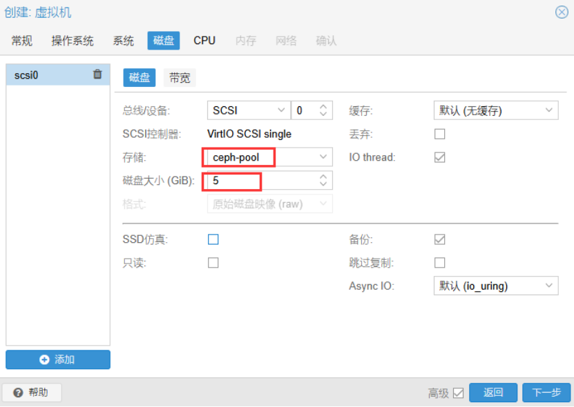 磁盘存放空间选择ceph-pool,磁盘大小5GB