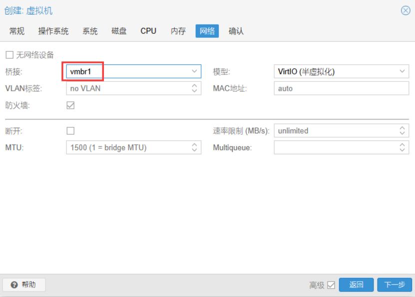 网络选择承载业务流量的虚拟交换机vmbr1,最后完成虚拟机的创建。