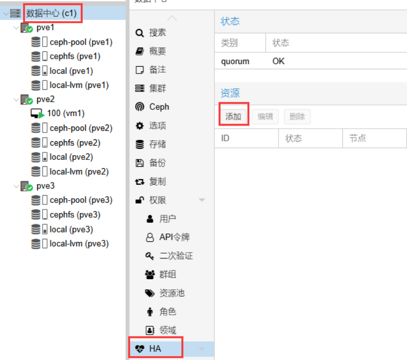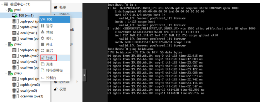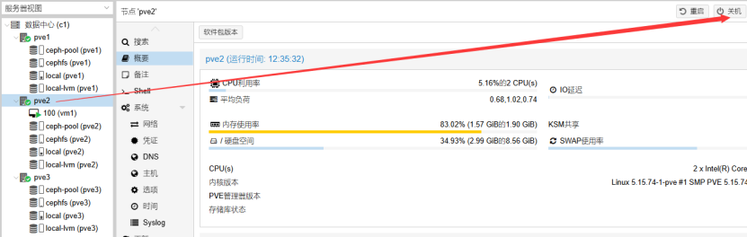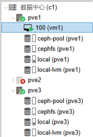 节点pve2故障后,pve2上的虚拟机自动迁移到节点pve1上,且正常运行。